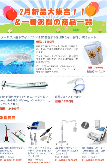 また、ほかの機械、例えば、口腔用 光照射器や技工用ハンドピースなども今、セールしています。